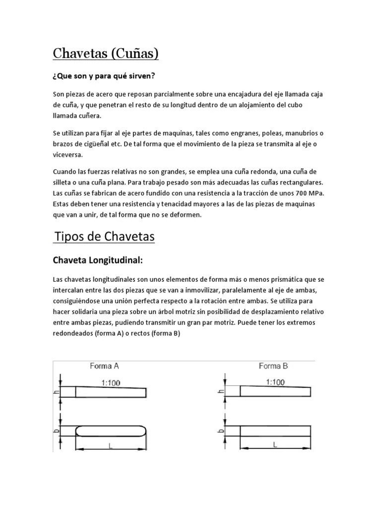 Se denomina chaveta a una pieza de sección rectangular o cuadrada que se inserta entre dos elementos que deben ser solidarios entre sí para evitar que se produzcan deslizamientos de una pieza sobre la otra. • chaveta longitudinal • chaveta transversal • chaveta tangencial • lengüeta de ajuste • lengüeta de disco • lengüeta prismática aplicación de chavetas: Difieren únicamente en la forma de su sección. Asegura el mejor centrado del eje y la pieza rozante, permitiendo realizar uniones inmóviles, como también, uniones resbaladizas. É importante que você assista. Difieren únicamente en la forma de su sección.